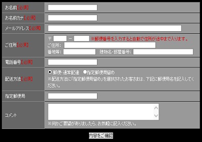 (4)注文フォーム画面にて、個人情報等の必要な情報を入力していただき、【ご注文および入力内容を確認】ボタンより、最終的なご注文の内容を確認してください。商品画像下のオプション選択項目からオプションの変更、商品削除が出来ます。オプションなしの場合はミニジャケット付属になります。